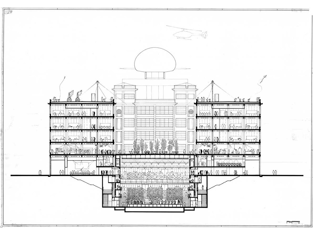 Il dispositivo architettonico è un progetto di riconversione da fabbrica di automobili a centro polifunzionale ( centro fiere congressi uffici e negozi auditorium albergo) – quindi la funziona principale non è “il salone del libro ” ma il salone del libro è una delle funzioni. Una città nella città. Un elenco di funzioni di sistema in grado di ospitare funzioni di sub-sistema.